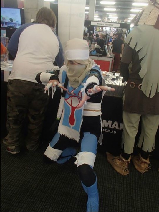 I had to do a little reaserch on this cosplay as I never had the pleasure to play The legend of Zelda Ocarina of time. Sheik is actually princess Zelda masking her apearence as a male Shiekah to acomplish her goal’s in secret. the lady cosplaying Shiek (or was she cosplaying princess zelda???) did a amazing job of it. she was with her a friend who was cosplaying Skull kid from another Zelda game and they where into these character’s. Our green link went up to her to ask for a photo, she was browsing manga when nick asked her for her photo in but a split second she was in a pose waving her hand’s like she was weaving a spell. While I didnt understand the significance of the pose I apreciated and enjoyed her enthusiasm for the character she was cosplaying. we stood here in aww at both Shiek and her friend Skull kid obviously a lot of effort went into there costumes.